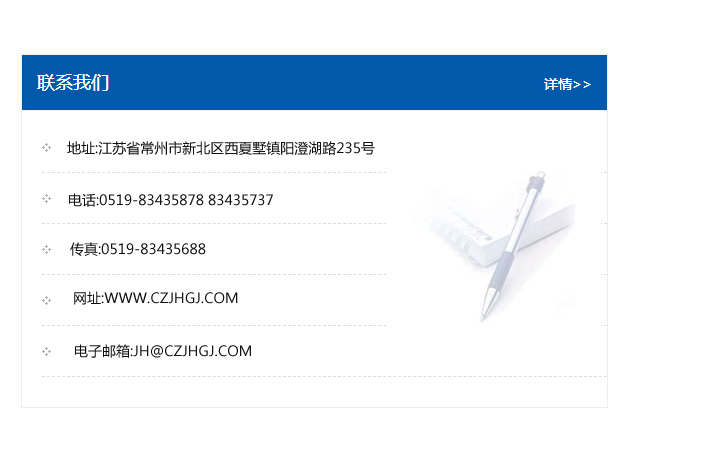 地址:常州市新北區友邦商務大廈1幢16、17層  電話:0519-85101652  傳真:0519-85112595  郵編:213022  網址:www.cz-jiayue_cn.gdjcstkj.com  郵箱:xiajifengaa@163.com